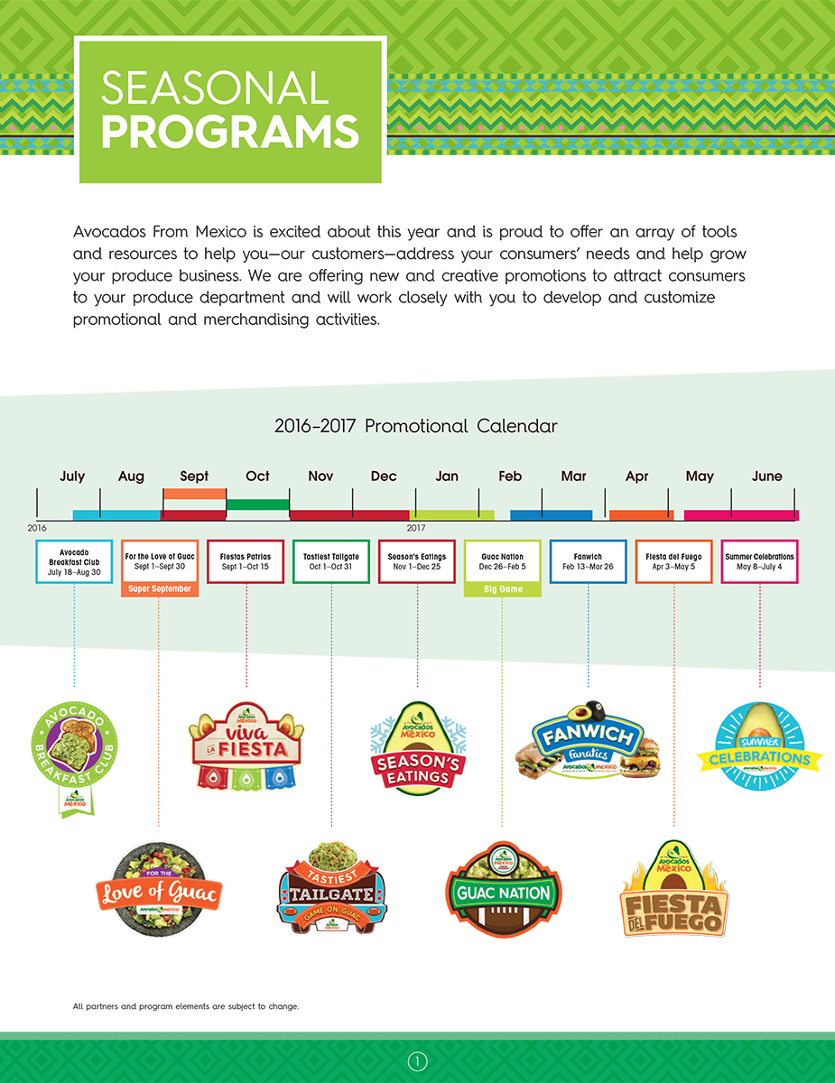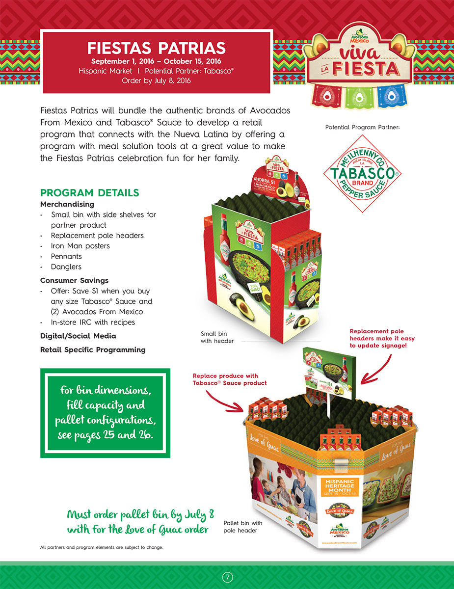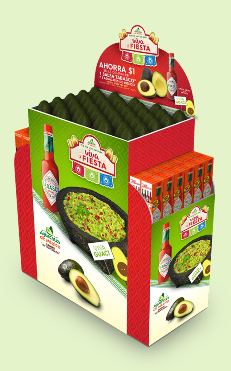 When Avocados From Mexico created a new program focusing on hispanic heritage I was tasked with developing the logo. Three options were developed with the requirements of using brand typefaces and colors while expressing "Mexicanity" and representing the product. We were also tasked with naming the program. After many brainstorming sessions we decided on Viva la Fiesta. The chosen option integrates hispanic architecture and papel picado (paper banners) creating an upbeat and lively atmosphere while maintaining a strongly branded program mark.
