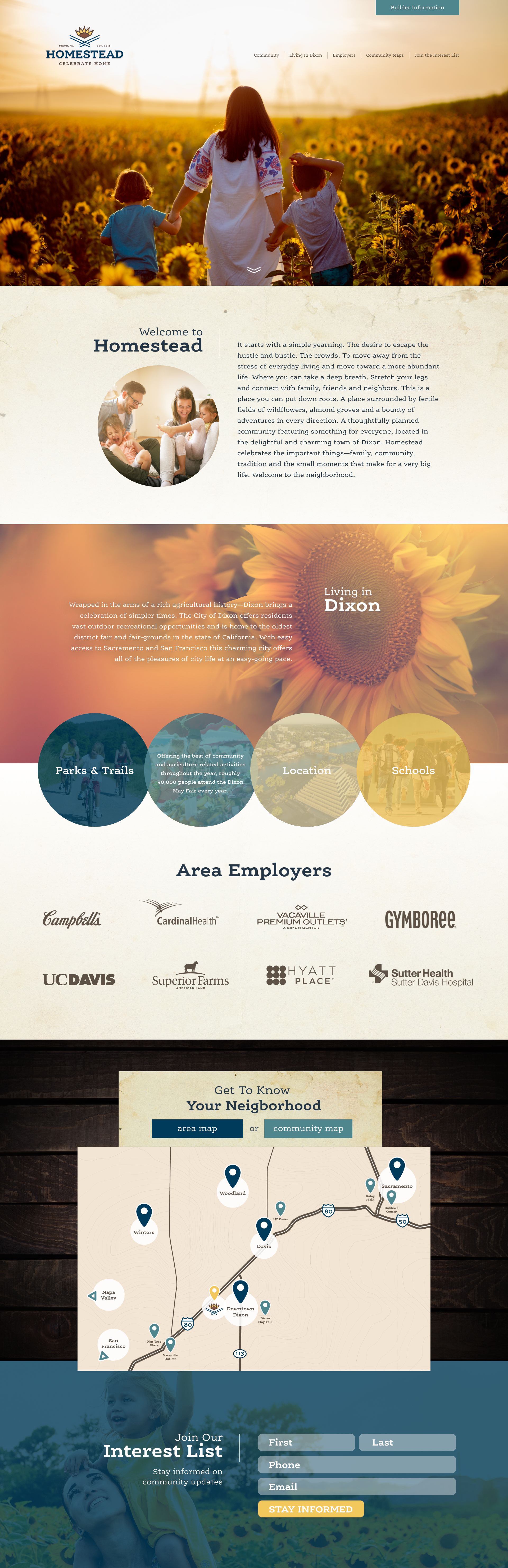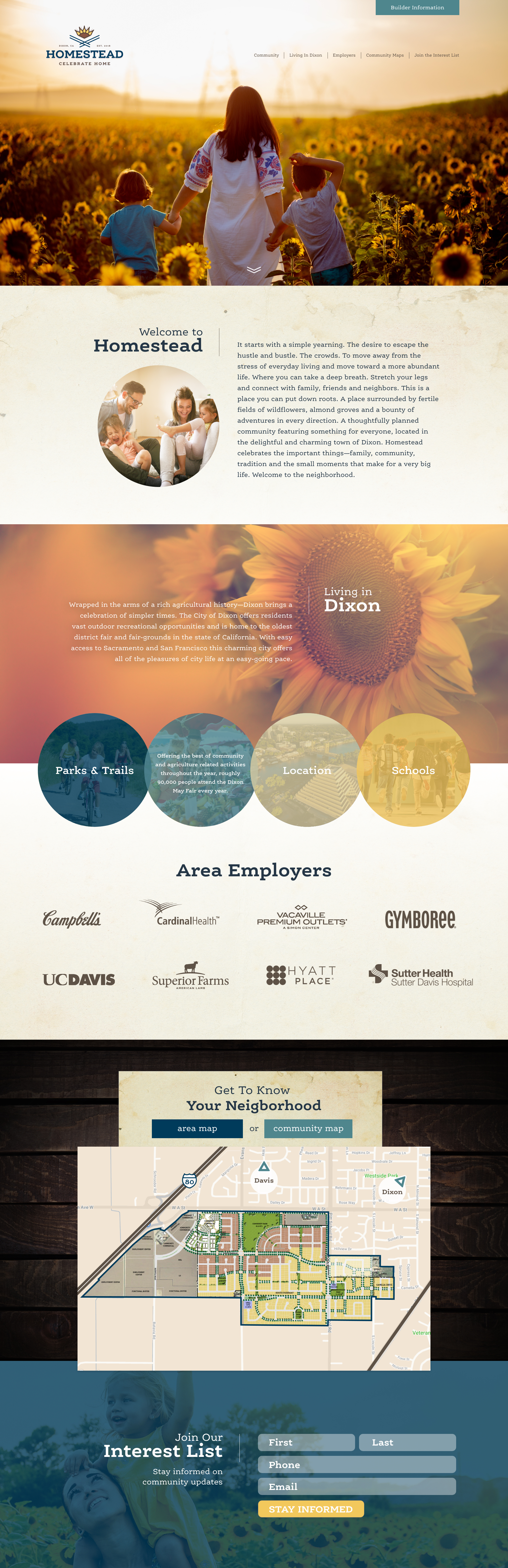 Leveraging the newly created Homestead brand, the Homestead landing page was designed to be approachable and inviting. With emphasis on family and community, supporting imagery tells the story of Homestead. Users can explore the community through the brand story, ammenity callouts, area employeers, and area maps. As the community develops, future residents can get all the latest updates by filling out an interest form.